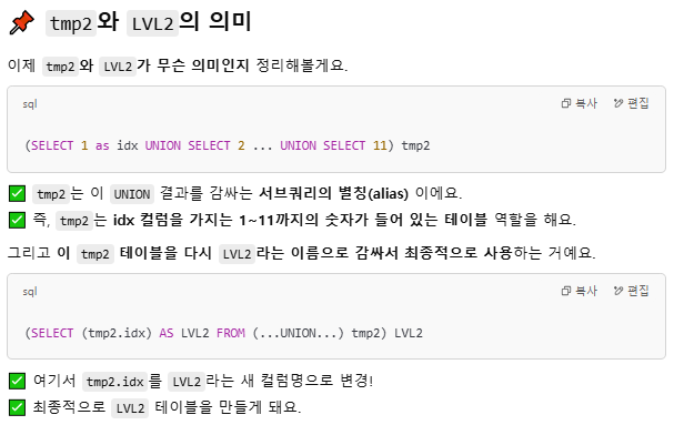 FROM (SELECT 1 as idx UNION SELECT 2 UNION SELECT 3 UNION SELECT 4 UNION SELECT 5 UNION SELECT 6 UNION SELECT 7 UNION SELECT 8 UNION SELECT 9 UNION SELECT 10 UNION SELECT 11) tmp2) LVL2